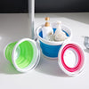 Com Suporte para Pendurar na Parede e Ganchos, feito em Silicone possui alça para carregar e suporte para mão no fundo do balde. Fechado pode ser guardado em espaços pequenos, atrás ou entre os móveis, pendurado na parede.